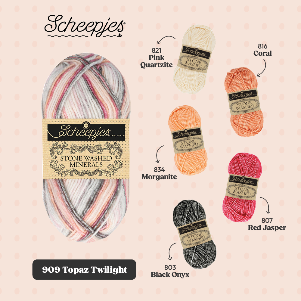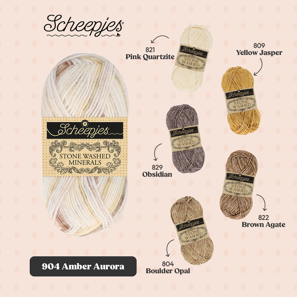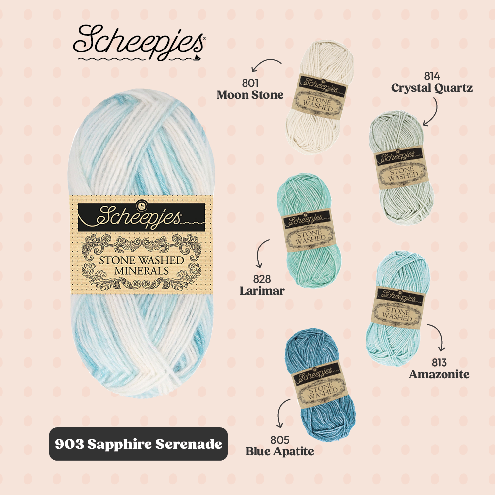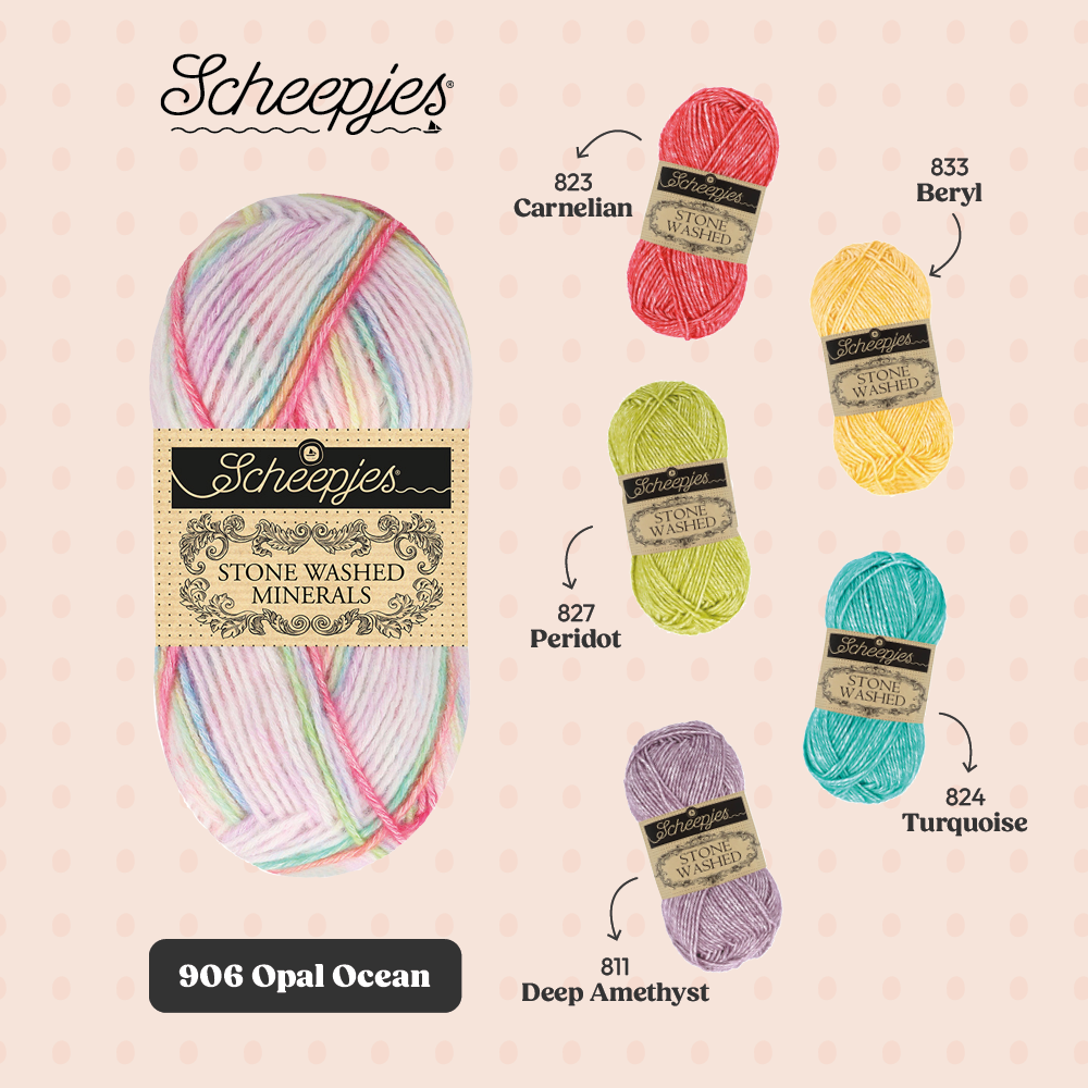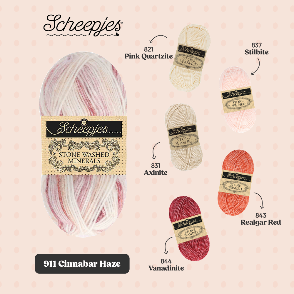Met oog op crafters die graag hun Stone Washed garencollectie willen uitbreiden, biedt de Minerals serie 20 kleurstellingen die bestaan uit 5 verschillende kleuren uit de Stone Washed collectie. De kleuren kunnen dan ook perfect worden gecombineerd binnen bestaande patronen en zo kun je items creëren die jouw persoonlijke stijl weerspiegelen.